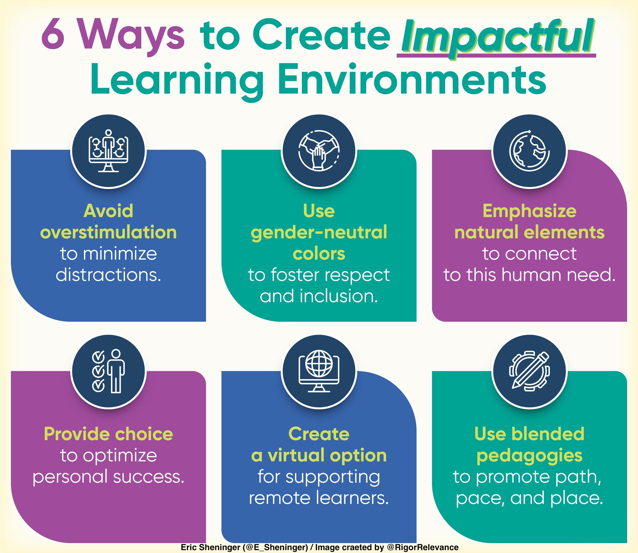 When creating impactful learning environments, both physical and virtual, consider the following:
